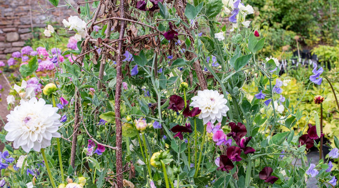 When you think of English gardens, sweet peas are a staple. Heirloom ‘Painted Lady’ twirls up this rustic twig trellis with abandon.